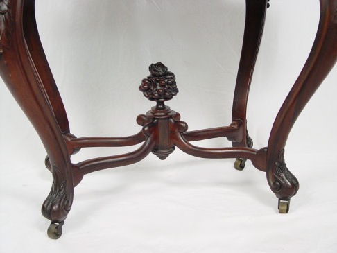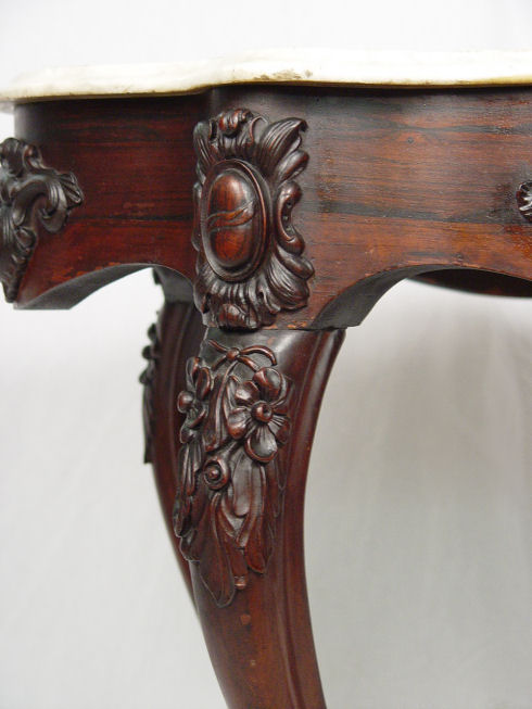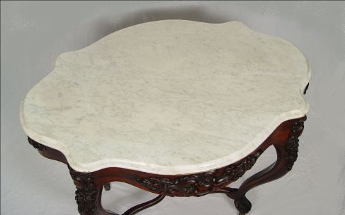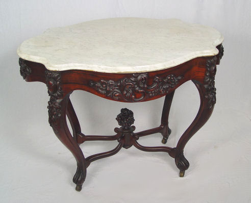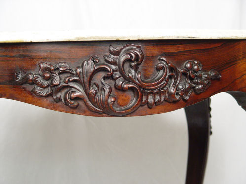 BELTER ROSEWOOD & MARBLE TURTLE TOP TABLE: Carved apron and legs, center cross stretcher meets in center with carved floral finial. The marble is white, 28 1/2'' x 38 1/2'' x 26 1/2''. Please call for condition.