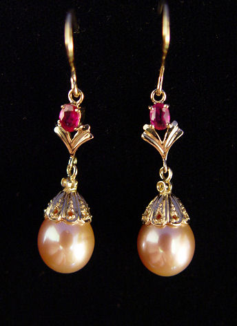 ROSE PINK PEARL DANGLE EARRINGS: 14k yellow gold earrings set with oval cut rubies supporting 9mm cultured pearls, short shepherd hook backs. Approx. 1 1/2''l., 4.5 grams.