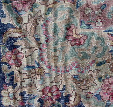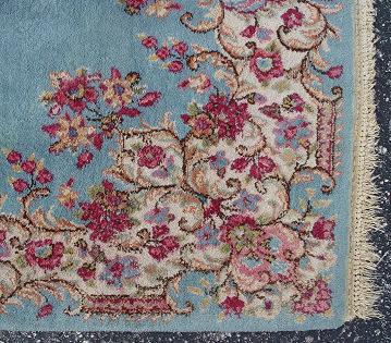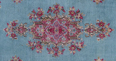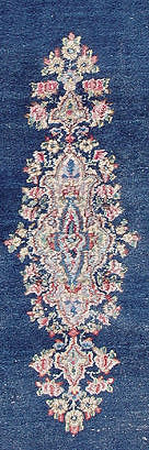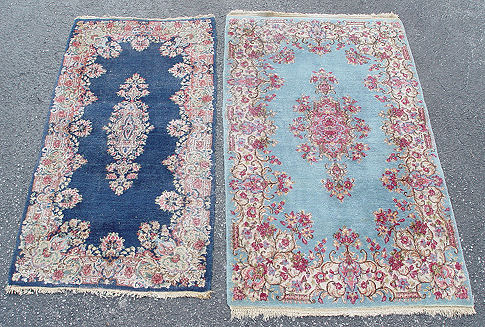 TWO KIRMAN RUGS: Both with floral borders and center medallions. Dark blue ground, approx. 2'5'' x 4'9'' and light blue with fuchsia flowers 3' x 5'2'' approx.