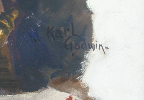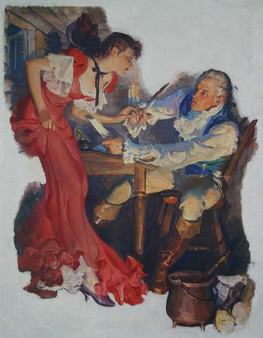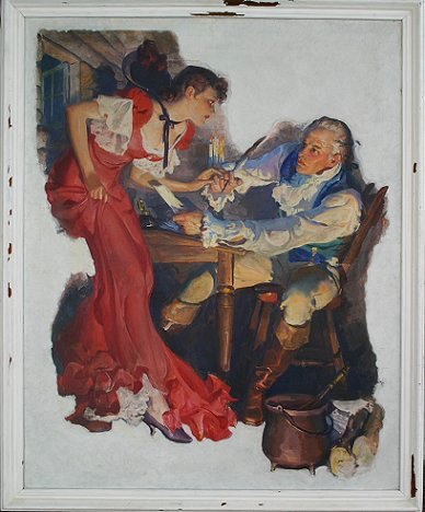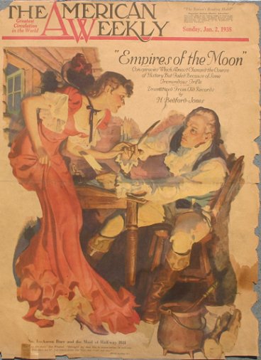 GODWIN, Karl, (American, 1893-1962): ''Aaron Burr And The Maid Of Half-Way Hill'', O/C, 40'' x 32'', signed lower right, encased in painted over frame, 44'' x 36''. This illustration was done for The America Weekly Magazine dated January 2, 1938. The title of the article is ''Empires Of The Moon''. Sold with an original copy of the Magazine cover.