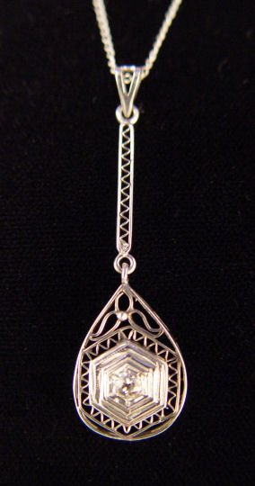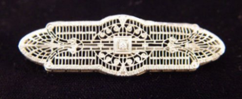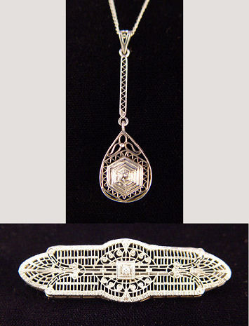 2 PC ESTATE LOT OF 14K WHITE GOLD FILIGREE JEWELRY: To include, 1 1/2'' pendant centered by an approx. 10pt diamond, on a simple 14k gold chain, 19''l. Filigree bar pin set with a tiny diamond, please note bends in pin, approx. 2 1/8''l. 5 grams total. Sold as a lot.
