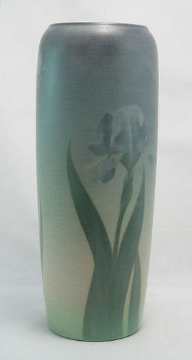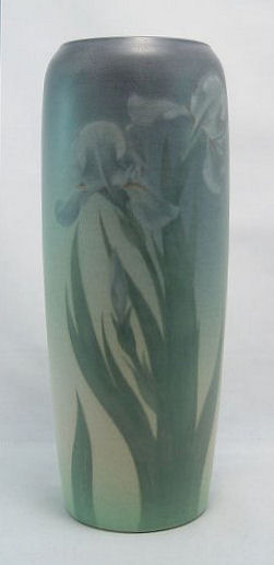ROOKWOOD ART POTTERY VASE, CARL SCHMIDT: Vellum glaze, finely painted iris flowers, 1915, #951B, 12 3/4''h. Finely executed by Carl Schmidt.