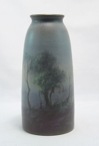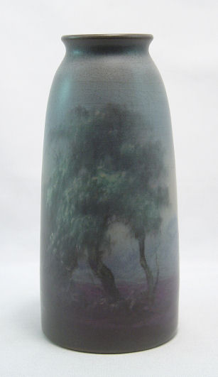 ROOKWOOD ART POTTERY VASE: Fabulous scenic landscape painted by Fred Rothenbush in 1915, #1658E, 8 1/8''h.