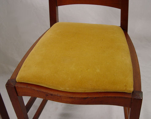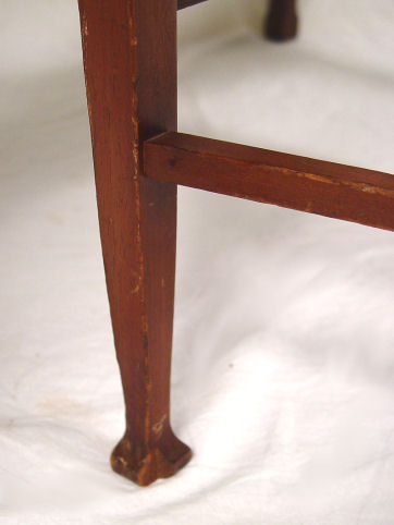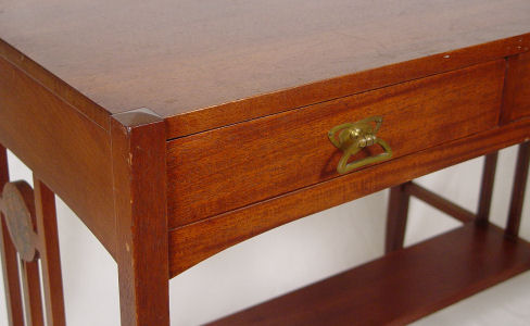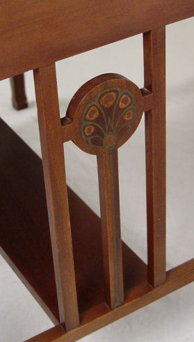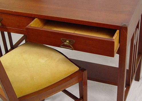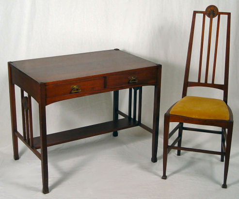 PETITE ART NOUVEAU TRANSITIONAL DESK WITH MATCHING CHAIR: Walnut 2 drawer writing table, inlaid design on side supports matches inlaid design on chair crest. Original Nouveau drawers. Very Mackintosh influence. 28 1/4''h. x 34'' x 21 3/4''. Chair is 43''h, 16 1/2''w.