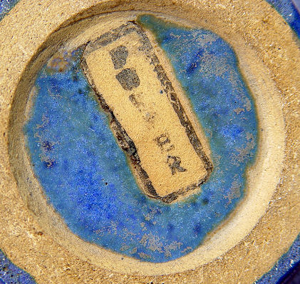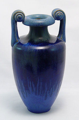 FULPER ART DECO POTTERY VASE: Most striking blue drip glaze, curled scroll handles, vertical Fulper ink stamp mark. 11 1/4''h. Est. $650/800**