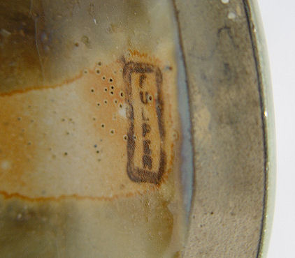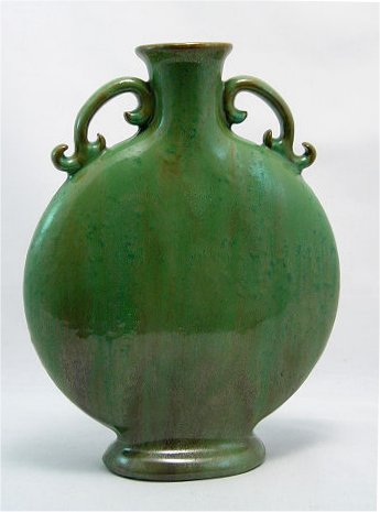 FULPER POTTERY CANTEEN FLASK VASE: Green drip glaze, vertical ink stamp mark, 10 1/4'' h. x 7 1/4''.