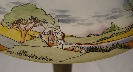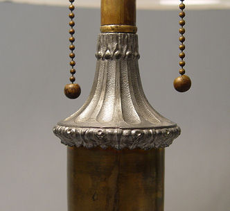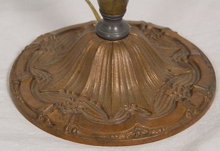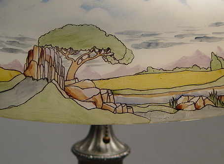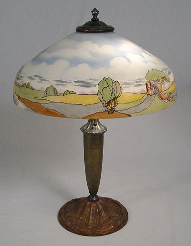 PITTSBURGH OBVERSE PAINTED LAMP: Landscape painted on the exterior of the domed glass shade. Iron base, mixed metal stem, double socket pull chain. Please note minute flecks on rim of shade. Unsigned. Lamp is 22''h. overall, shade is 16'' dia.