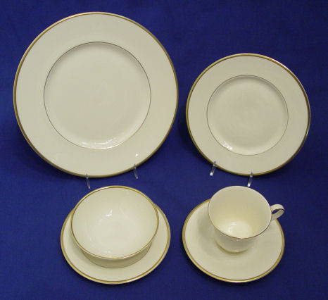 ROYAL DOULTON FINE CHINA IN THE ''HEATHER'' PATTERN: From the romance collection. 29 pieces to include 7 dinner plates, 6 salad plates, 6 bread plates, 4 dessert bowls, and 6 cups and saucers. Gold rim on ivory.