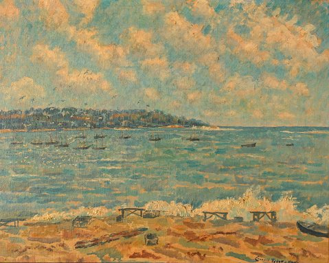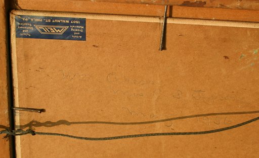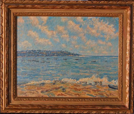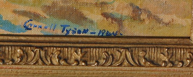 TYSON, Carroll, (American, 1877-1956): Maine harbor scene depicts a view from Mt.Desert Island with possible location of Somes Sound or Bar Harbor, O/CB, 16'' x 20'', signed lower right and dated 1944, in the back in pencil is written ''William Cress from Mrs. C.S.Tyson, May 1956'' encased in original gilded frame with minor wear, 21 1/2'' x 25 1/2''.