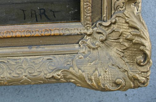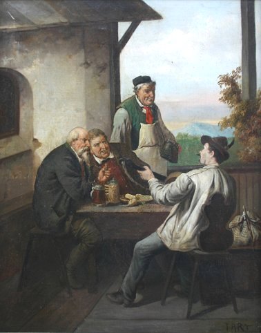 19TH CENTURY GENRE SCENE DEPICTING MEN SITTING AT A TAVERN TABLE: O/C, 26'' x 21'', signed lower right Tart, encased in a gilded overpainted frame with some repair, 32'' x 27''.