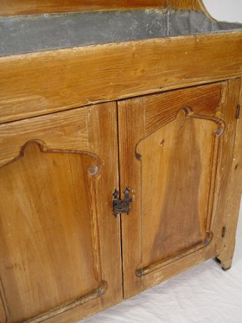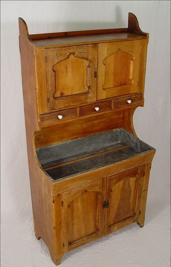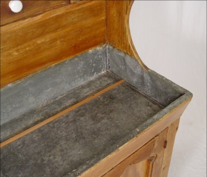EARLY DRY SINK CUPBOARD: Featuring tin lined well and interior storage behind the paneled door. All one piece with the sides being one board. It probably was painted at one point in time. Nice old wear. Approx. 6' tall. x 36'' x 17''.