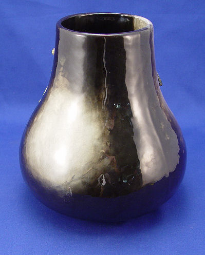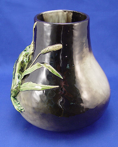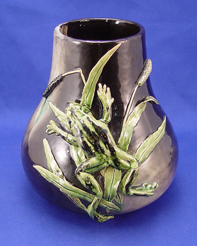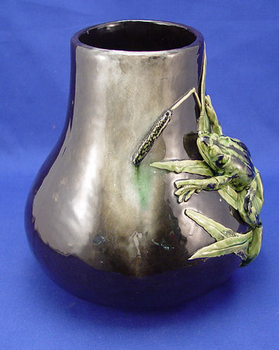 T.J.WHEATLEY ART POTTERY VASE WITH APPLIED DECORATION: Applied frog and reed, high gloss glaze, signed in script. 8 3/4'' h. 4'' dia. at the rim, 8'' dia. of the bulbous body. Free of chips or cracks.