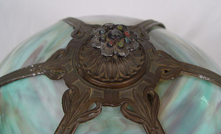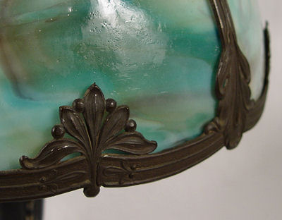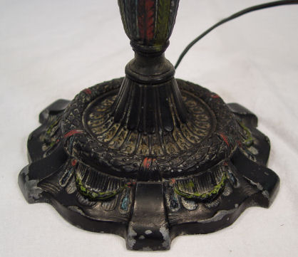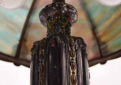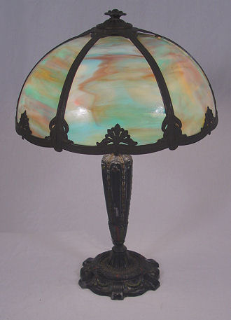 VINTAGE 1920'S SLAG GLASS LAMP: 6 panel domed shade in shades of blue and purple. The polychrome base is in somewhat worn condition. Double socket still in working order, though the pull chains are missing. The lamp is 21 1/2''h, shade is 14 1/2'' dia.