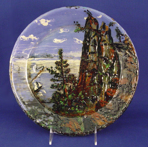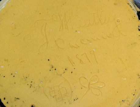 1879 TJ WHEATLEY POTTERY PLATE: Scenic landscape in the barbitone technique of decoration. Incised markings ''TJ Wheatley Cincinnat 1879'' along with artists marks. Approx. 10 3/4'' dia.