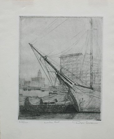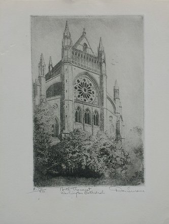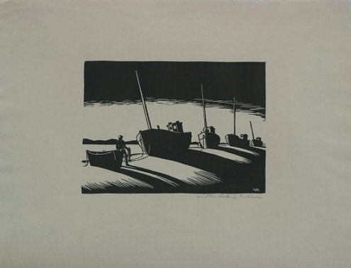 4 PIECE PRINT LOT TO INCLUDE: (1) RICHARDS, Walter Dubois, (American, 1907-), at low tide, Linocut, 10'' x 12 3/4'' full size, image size 4 3/4'' x 6 1/2'', signed in pencil lower right. (2) SWANN, Don, (American, 1889-1954), 2 pieces, ''North Transept-Washington Cathedral'', Etching, 11 1/2'' x 8 3/4, signed lower right and numbered 170 of 300 lower margin, original label affixed to mat. (3) Second piece is ''Lumber Boat'', Etching, full size 10'' x 8 1/4'', pencil signed lower right, numbered 228 of 300 lower left, titled in lower margin, original label included. (4) CUNNINGHAM, Phelps, (American, 20th C), ''Ohio Canal'', full size 12 3/4'' x 10'', pencil signed lower right, titled lower left. All pieces are unframed.