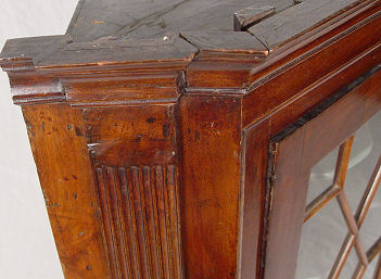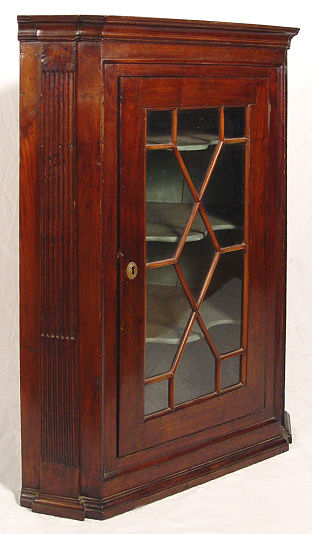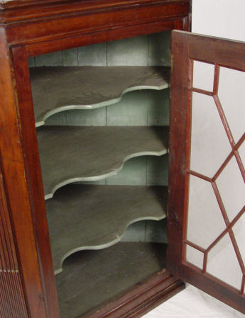 19TH C MAHOGANY CORNER CABINET: Individually glazed panes of glass, painted interior with shaped shelves. May hang on wall or rest on floor. 43'' h. x 34 1/2'' x 22''. Est. $1200/1400**