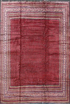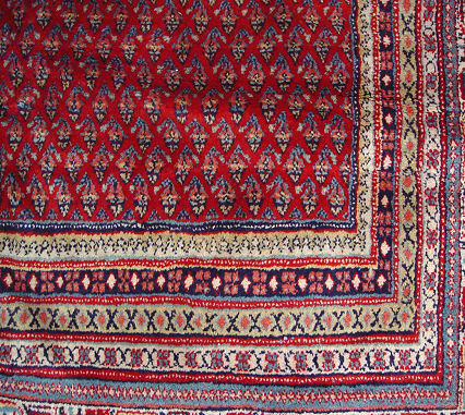 HAND KNOTTED BOTEH CARPET: Approx. 9'6'' x 13'5'', active ground with many narrow borders, hand knotted in Iran. (Yes, it has been rolled up for a little while.)