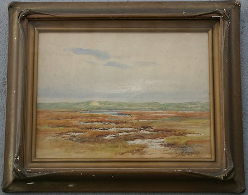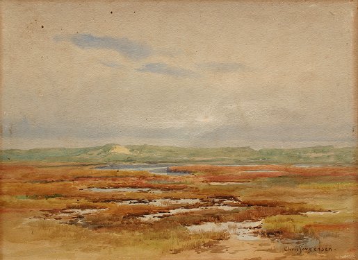 JORGENSEN, Christian August, (American, 1860-1935): Marsh landscape, W/C, 10 3/4'' x 15'', signed lower left and encased in period gilded gesso frame with wear and some minor damage to corners, 15'' x 19 1/2''. This is 1 of 11 paintings descending through the family directly to Jorgensen's great granddaughter, Mary Helen Anderson. Never before offered, fresh from the estate.
