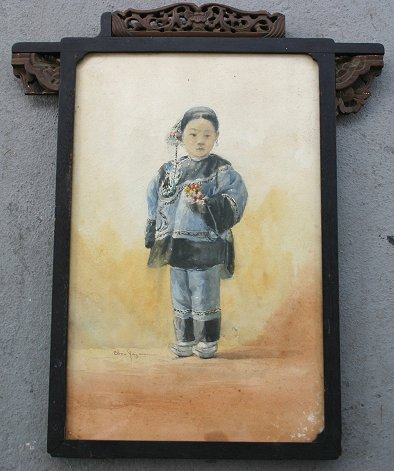 JORGENSEN, Christian August, (American, 1860-1935): Portrait of a female child, W/C, sight size 18'' x 11 1/2'', signed lower left, encased in a carved lacquer and gesso oriental motif frame with damage and repair, 21 1/2'' x 17 1/2''. This is 1 of 11 paintings descending through the family directly to Jorgensen's great granddaughter, Mary Helen Anderson. Never before offered, fresh from the estate.