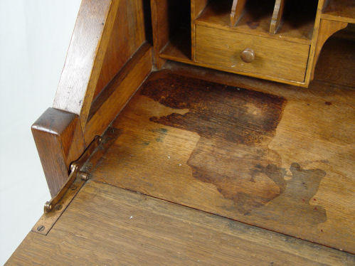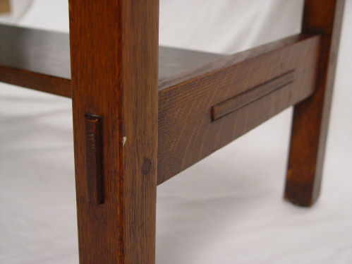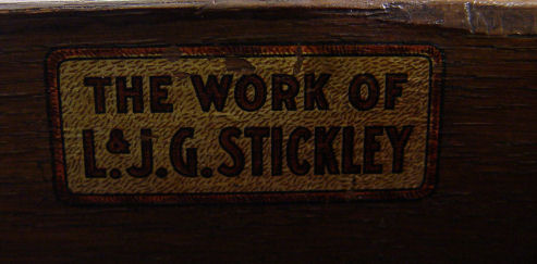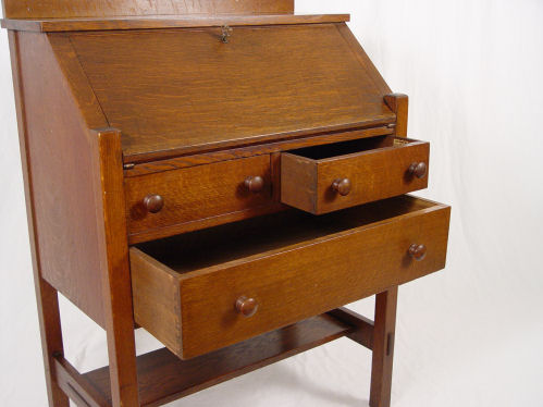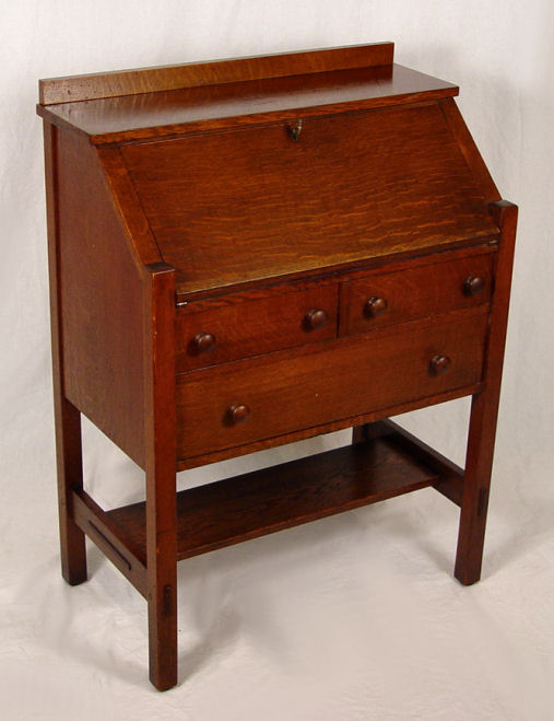 L&JG STICKLEY ARTS AND CRAFTS DROP FRONT WRITING DESK: Oak slant front desk, interior pigeon holes, exterior has two drawers over one full length drawer. Thru tenon construction. Decal label in drawer. 40'' h. x 29 x 16 3/4 h. overall. Pease call for condition.