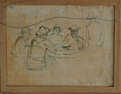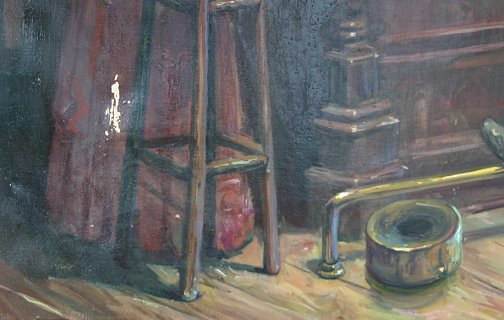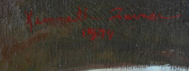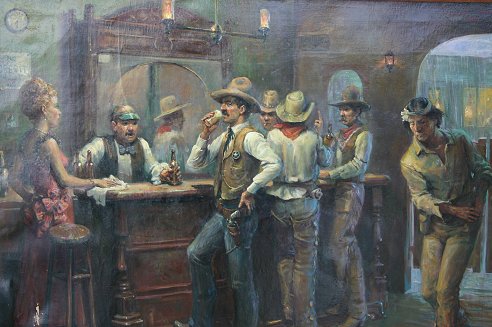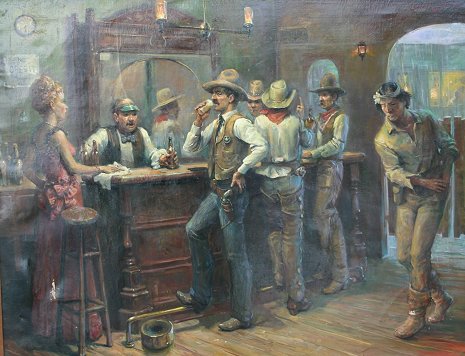 TURNER, Kenneth, (American, 20th C): Old time western saloon scene depicting cowboys, sheriff and a stumbling Indian, O/C, 28'' x 36'', signed upper right and dated 1979, encased in original gold frame with wear, 35'' x 43''.