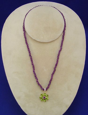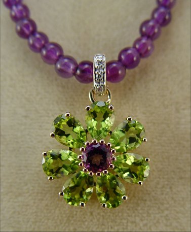 AMETHYST, PERIDOT AND DIAMOND NECKLACE: 14k yellow gold removable flower pendant set with faceted peridot petals and amethyst center, pave diamond bail attaches it currently to an amethyst bead necklace, 17''l., 5.91ct total weight. Est. $400/600**