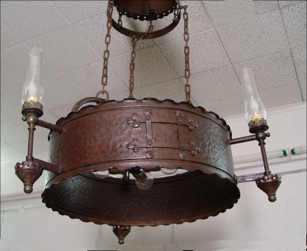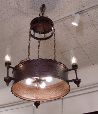 HAMMERED IRON ARTS & CRAFTS CHANDELIER: Patinated finish, 3 exterior lights with glass chimneys, 4 interior lights. 34''h, 20'' dia. Maker unknown.