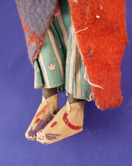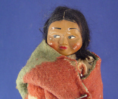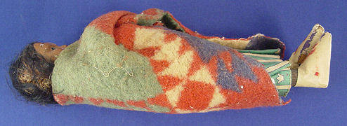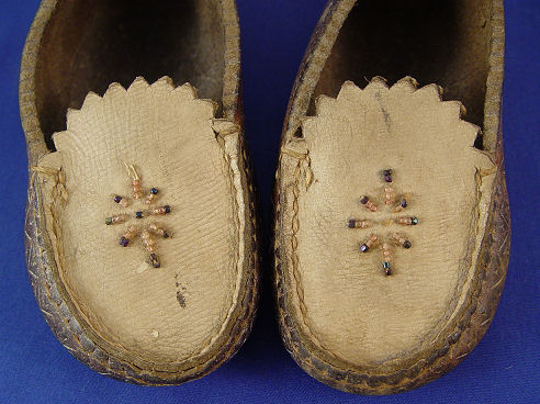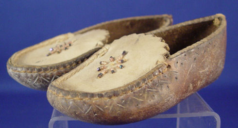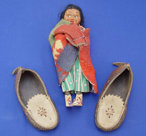 NATIVE AMERICAN CHILD ITEMS: To include, a Skookum Doll and a pair of hard leather moccasins. Doll is approx. 9 1/2''h., in ''played with'' condition, wood legs, straw body and head with hard painted face. Moccasins are hardened leather with etched design to upper edge, small amount of beading to center top, approx. 6''l.