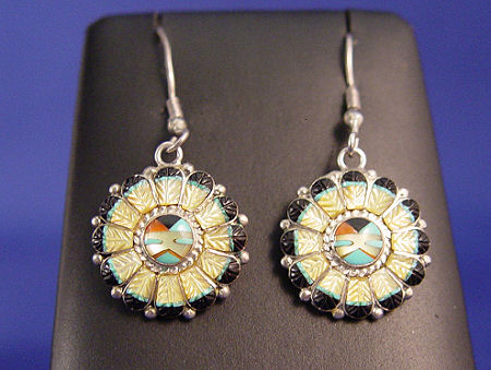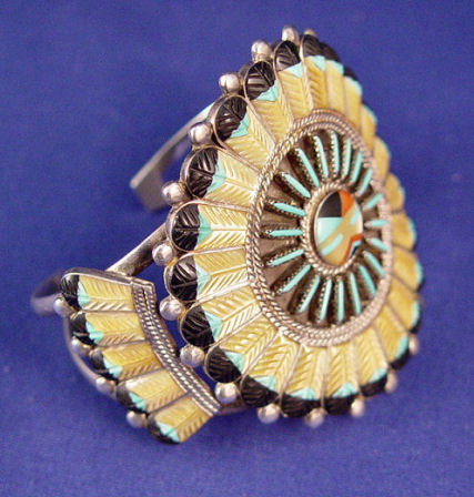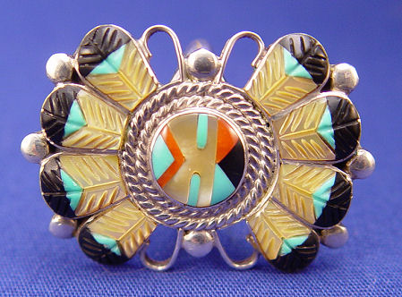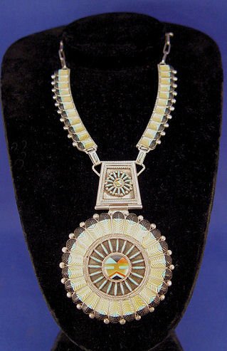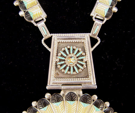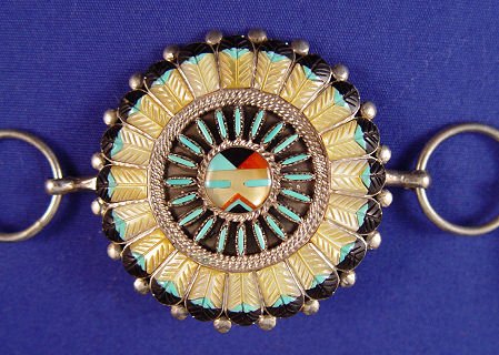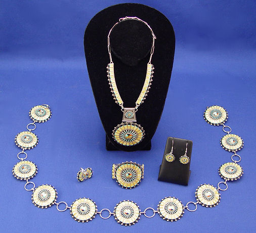 5 PC STERLING ZUNI JEWELRY ENSUITE: Sterling, Abalone, Coral, Turquoise, Jet. Belt with eleven inlaid links, signed AL, 36''l. Necklace 19''l., two piece pendant 3 3/4''l., signed PR. Matching cuff bracelet, 2 1/4'' x 1 3/4''; ring size 7 1/4, dangle earrings with shepherd hook findings. All pieces marked Sterling.