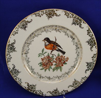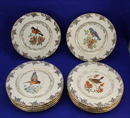 SET OF 12 HEINRICH BAVARIAN SERVICE PLATES: Gold lacy decorated border centering an image of bird and fauna. 11 1/4'' dia.
