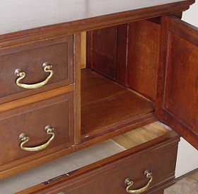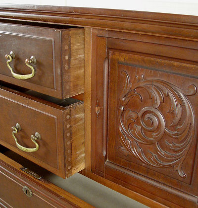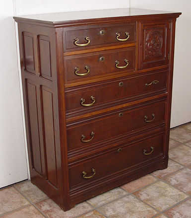 VICTORIAN COTTAGE CARVED WALNUT TALL CHEST CA. 1900: Carved hat box door, 2 half size drawers over 3 drawers. Original brass hardware. 48''h. x 40 1/2'' x 20''.