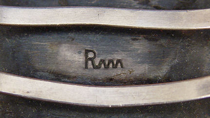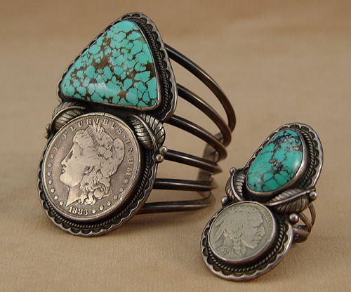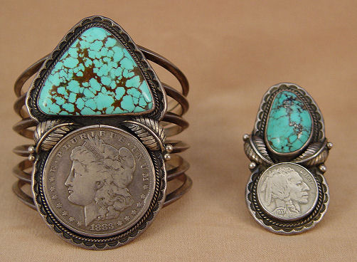 2 PC LOT OF TURQUOISE & COIN JEWELRY BY NAVAJO SILVERSMITH ROBERT LEE SMILEY: The ring has a wonderful piece of turquoise with silver in the matrix and a 1937 Indian Head nickel, size 10.5. The bracelet set with 1883 Liberty silver dollar on a six bar cuff which measures approx. 2 1/2'' x 1 3/4'', 3 1/8'' wide across top. Both pieces marked with the R and lowered ^^^ mark matched to Robert Lee Smiley on page 208 of Hallmarks of the Southwest by Barton Wright (very similar to Redwater mark on page 145 same book).