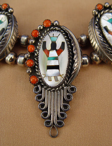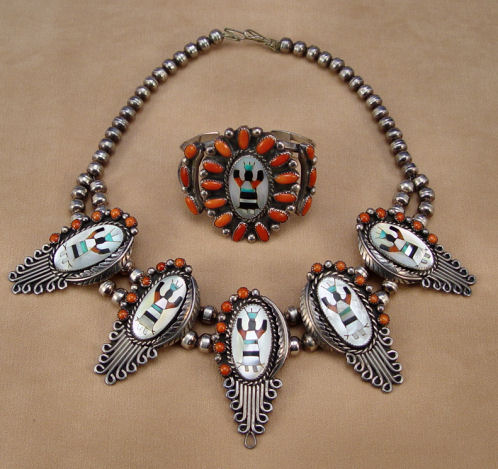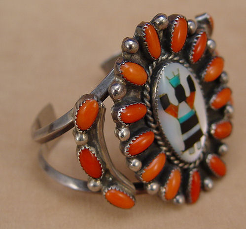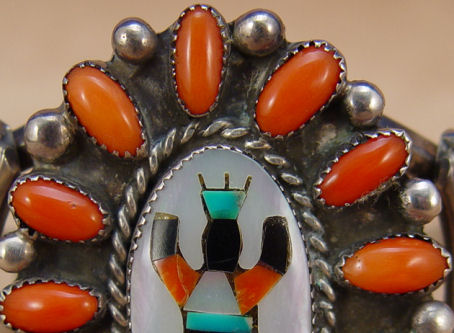2 PCS NATIVE AMERICAN SILVER, CORAL & MOSAIC NECKLACE & BRACELET: Both signed RHB. Silver bead necklace with 5 matching mosaic central figures, opposing coral decorations to side disks, 18'' l. Cuff bracelet centered by matching mosaic, surrounded by coral cabochons, top 2 1/4'', opening approx. 2 3/8'' x 1 3/4''.