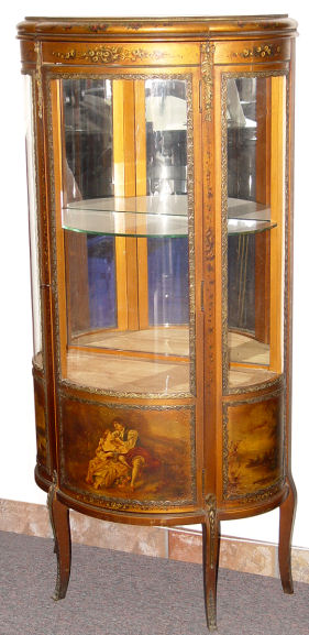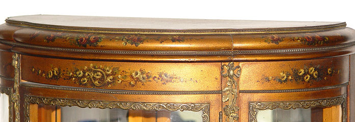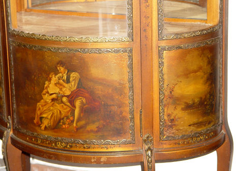 EARLY 20TH C FRENCH VERNIS MARTIN TYPE VITRINE: Hand painted florals frame the glass, courting scene on the door, ormolu mounts. One glass shelf, one cloth covered shelf, blind storage on lower interior. 55 1/4'' h. x 26 1/2'' x 13''.