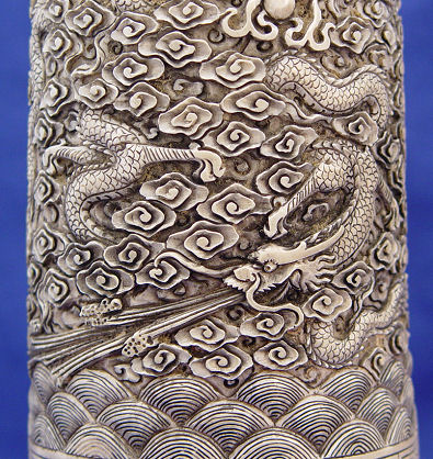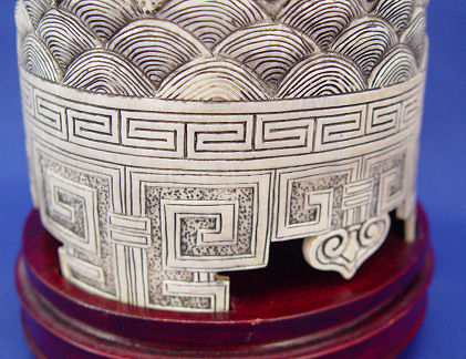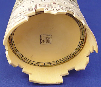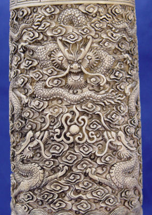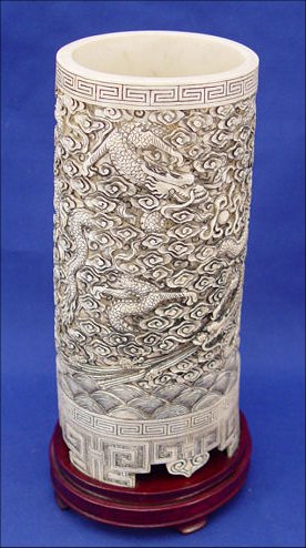 CHINESE CARVED IVORY ELEPHANT TUSK BRUSH POT: Carved en masse representing dragons, the sea and sky. Greek key type feet. 9''h, 3 3/4'' dia. Signed on the underside of base. Sold with custom fitted wooden base.
