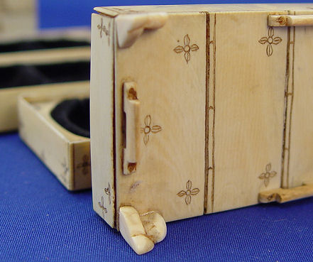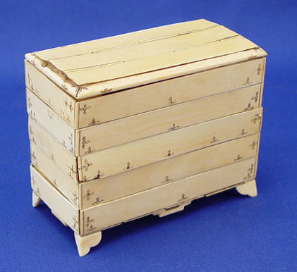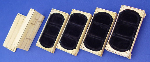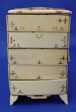 IVORY FIVE SECTION STACKING BOX: Each of the sections is a velvet lined divided tray covered in ivory strips. Unsigned, 3''h. x 3 3/4'' x 1 7/8''. Please call for condition.