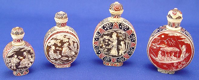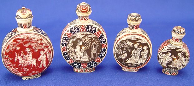 GROUP OF 4 RELIEF PAINTED IVORY SNUFF BOTTLES: Each painted on all sides in a different scene showing daily life. 2'' - 2 3/4''h. Artist signed.