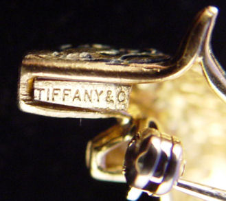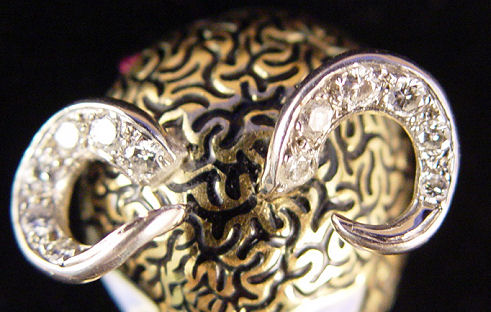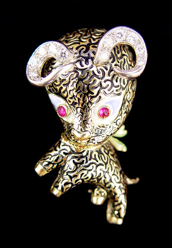 TIFFANY & CO ENAMEL AND DIAMOND FIGURAL RAM PIN: Adorable 18k yellow gold pin in the form of a ram with black enamel fleece, enamel eyes centered by bezel set rubies and white gold horns set with approx. 1/4ctw of diamonds. Marked M 18k Italy and Tiffany & C verso, approx. 1 3/4''l., 15 grams, with blue Tiffany Bag.