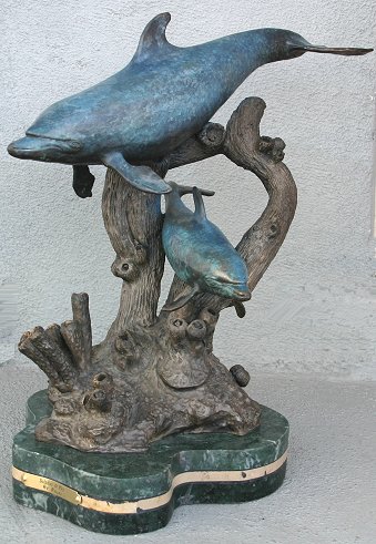 CONTEMPORARY BRONZE GROUPING ''DOLPHINS AT PLAY'' BY ROJAS: 17 1/4'' h., affixed to a shaped polished marble plinth, impressed signature, numbered 30 of 199.