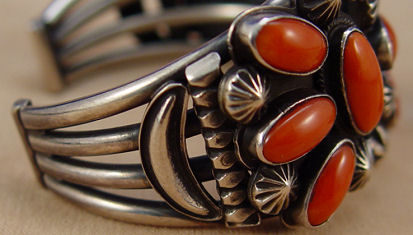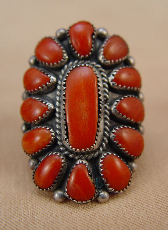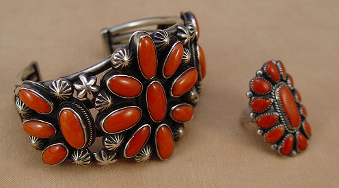 2 PCS CORAL AND SILVER NATIVE AMERICAN JEWELRY: To include, sterling cuff bracelet signed PJ Begay, Navajo silversmith, cuff opening approx. 2 1/2'' x 1 3/4'', 1 7/8''w. across top. Silver and coral ring signed J. Paselente, Zuni silversmith, size 7.