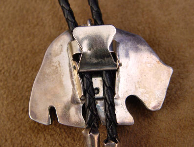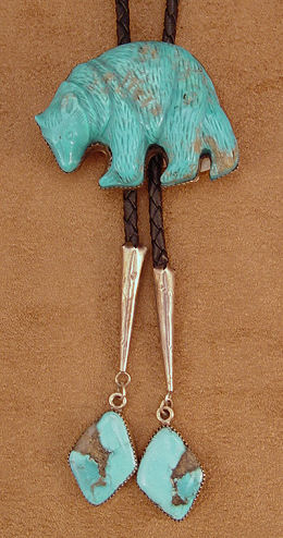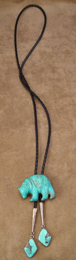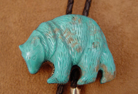 CARVED TURQUOISE BEAR BOLO SLIDE & PENDANT: Intricate carving of a rambling bear, sky blue turquoise set in silver with both clip for bolo tie and loop for pendant, braided leather tie ending in simple silver tips with turquoise rhombus dangles, bear measures 1 3/4'' X 2 1/4'', approx. 38'' tie.