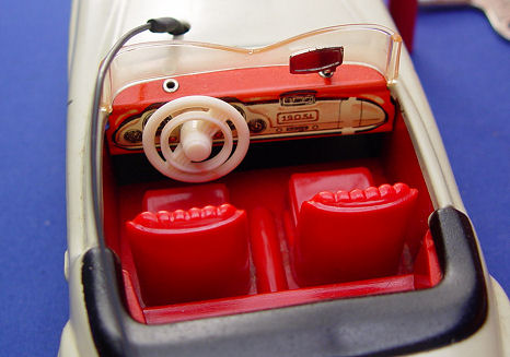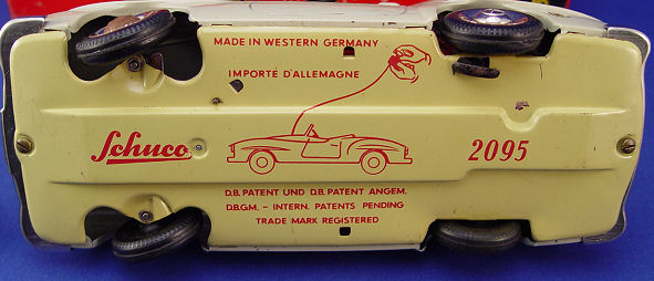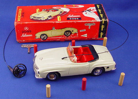 VINTAGE SCHUCO MERCEDES 190 SL IN THE BOX: Key wind tin toy in original box, key included along with 6 course markers. 8 1/2''l. Very good condition with minor rust just starting on drivers door.