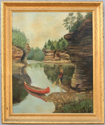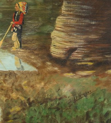 AMERICAN FOLK ART, O/C, DEPICTING AN INDIAN WITH CANOE ON A CANYON RIVER EMBANKMENT: 20'' x 16'', signed lower right L.Fletcher, encased in a gilded frame with wear, 23 1/2'' x 19''.