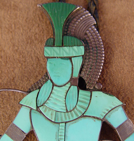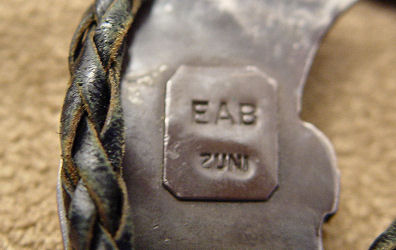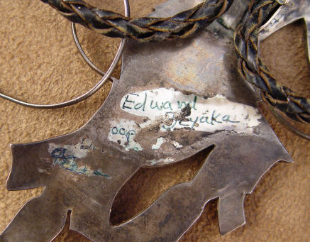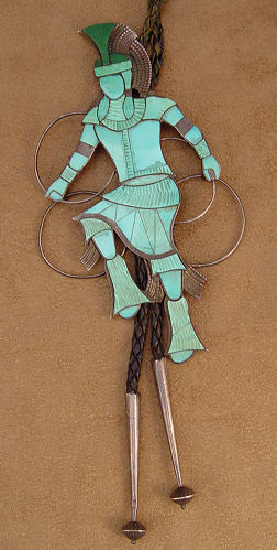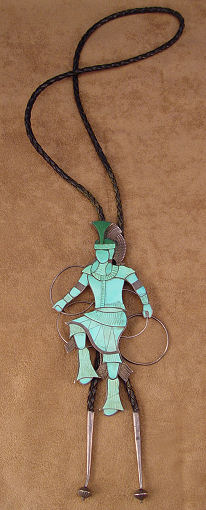 HOOP DANCER BOLO SLIDE BY ZUNI SILVERSMITH EDWARD BEYUKA: Classically simple design by master silversmith Eddie Beyuka of a Zuni hoop dancer, created of silver and etched and pieced turquoise, bolo slide measures approx. 6'' x 3 1/4'', braided leather tie ends in silver button tips, overall 40''l. tie.