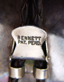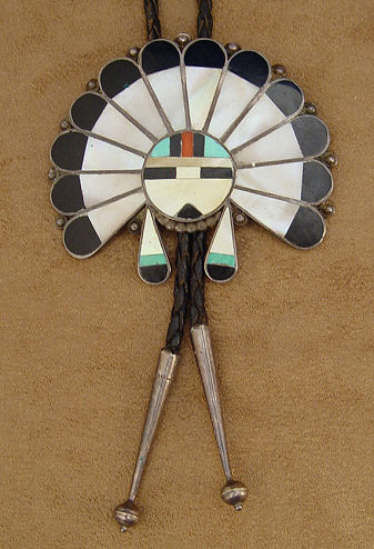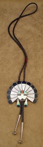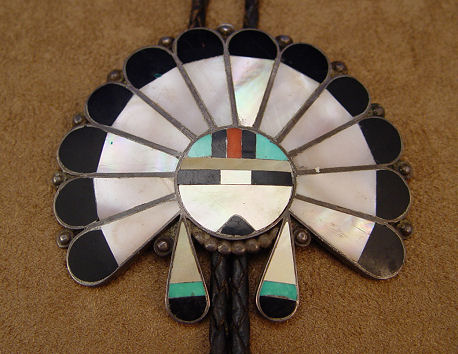 ZUNI MOSAIC HEADDRESS BOLO SLIDE: Traditional headdress, front view, approx. 3'' X 3 1/2'', clip marked Bennett Pat Pend, braided leather tie ending in silver tips, overall approx. 38''l. tie.