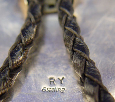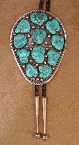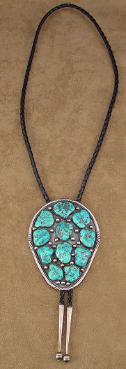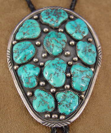 TURQUOISE & STERLING BOLO SLIDE: 11 chunks of turquoise, some with silver in the matrix, set on a large sterling slide, braided black leather tie ending in silver tips approx. 36''l., slide signed RY, marked Sterling, measures approx. 4'' x 3 1/4''.