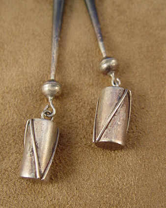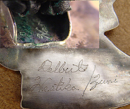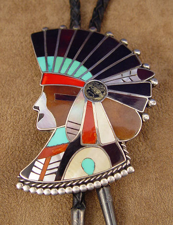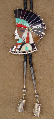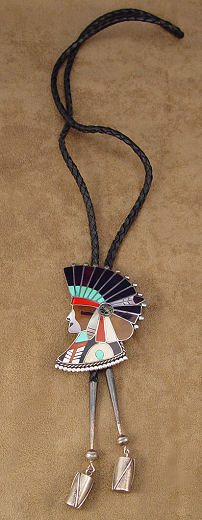 ZUNI FIGURAL BOLO SLIDE: Mosaic profile of chief in headdress, signed Delbirt? Westika Zuni, clip marked Bennett Pat Pend, 3 1/2'' x 2 1/2'', braided leather tie ending in silver tips with drum dangles, tips overall 3 1/2''l., 43'' tie.