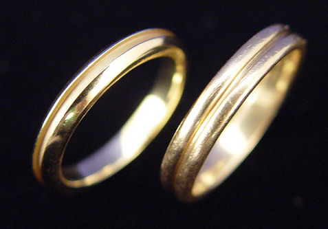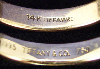 TIFFANY & CO MEN'S GOLD BANDS: Lot of two yellow gold bands - 18k highly polished gold edges with matt gold center trough, marked ''1995 Tiffany & Co. 750'', size 8.5, 5.5 grams. 14k faux double band, marked ''14k Tiffany & Co'', size 10.25, 4.7 grams. Sold as a lot.