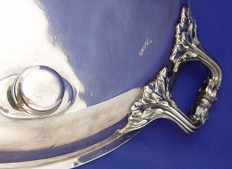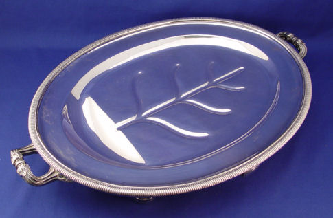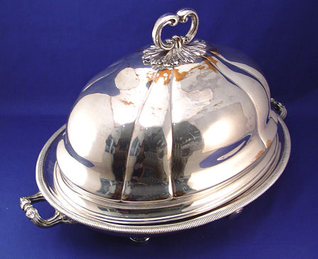 LARGE SILVERPLATE MEAT DOME AND WARMING TRAY: The tray bears English hallmarks, maker H&L, also stamped Thomas Bond St., juice wells and handles, 23''l. overall. The dome is unmarked, has copper showing under the silver, 18''l, 13''h., including handle.