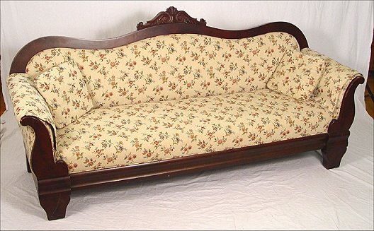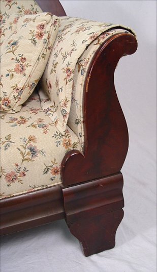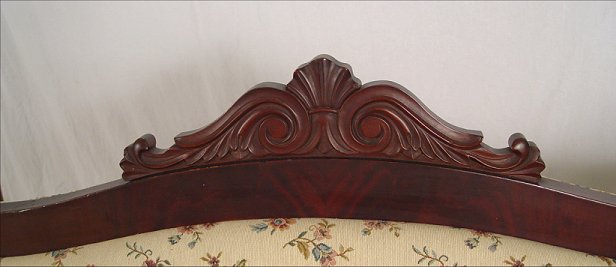 AMERICAN EMPIRE MAHOGANY SOFA: Carving on top center of crest, curved top rail, straight skirt. 7' long, 36 1/2''h.